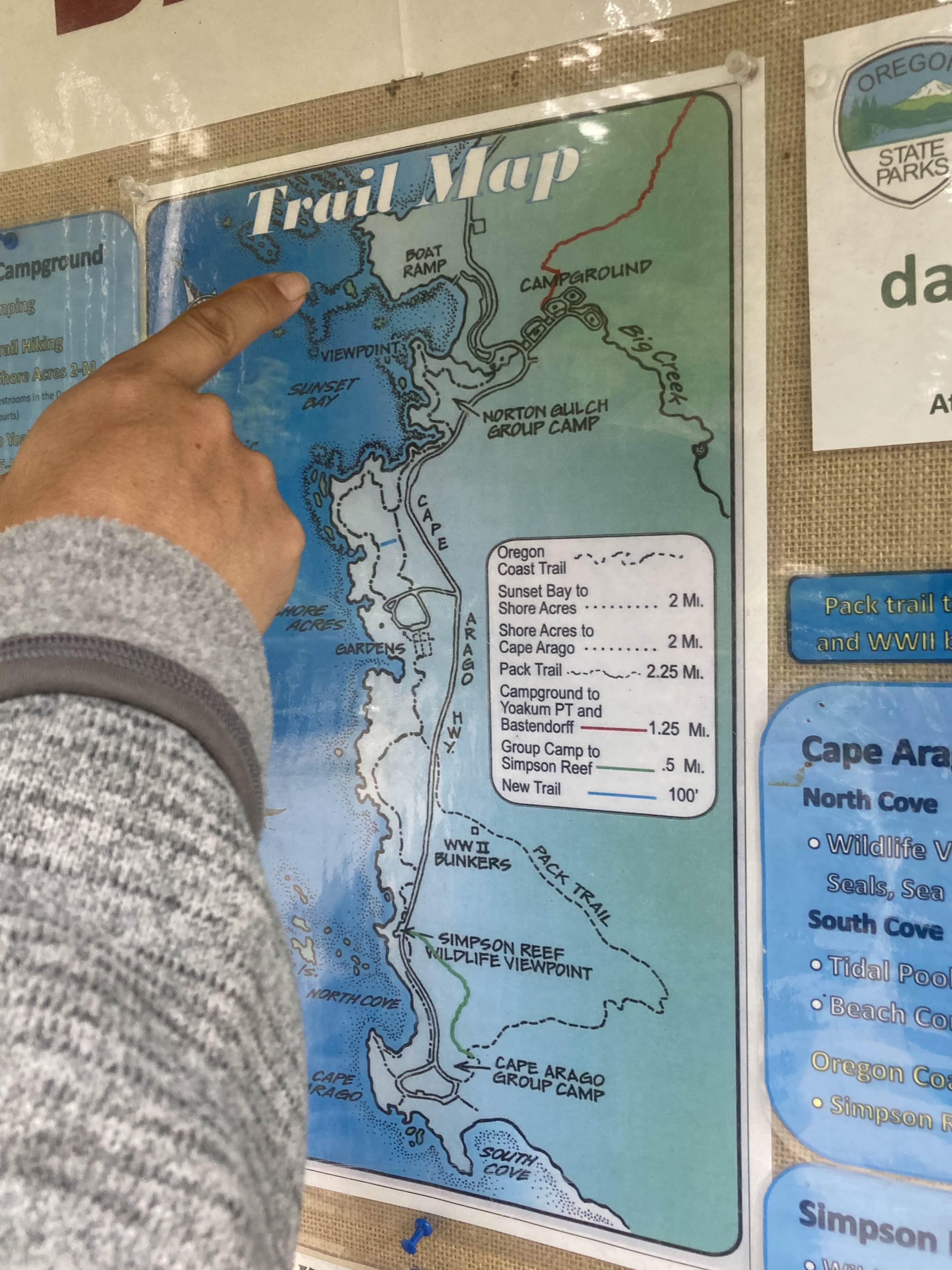 One mile north of Shore Acres, Sunset Bay State Park offers overnight camping facilities and a sheltered beach. One mile to the south, Cape Arago State Park has hiking trails, picnic tables, and excellent opportunities for viewing tidepool life and the offshore colonies of seals and sea lions on Shell Island and Simpson Reef, part of Oregon Islands National Wildlife Refuge. All three parks are connected by a segment of the Oregon Coast Trail.